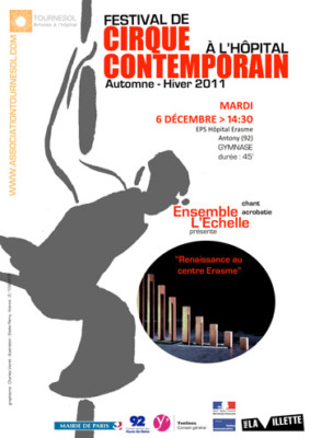 L'association Tournesol, artistes à l'hôpital organise un festival de cirque contemporain dans cinq établissements hospitaliers d'Ile-de-France. Ainsi, l'Etablissement public de santé Erasme à Antony (92) va accueillir en résidence du 29 novembre au 6 décembre l'ensemble Echelle. Une représentation montrant aux patients le fruit de cette résidence aura lieu le 6 décembre à 14h30. A signaler également : le Centre hospitalier Théophile-Roussel de Montesson (78) et l'hôpital Rothschild à Paris ouvriront leurs portes à 3 spectacles d'acrobatie et de jonglage.