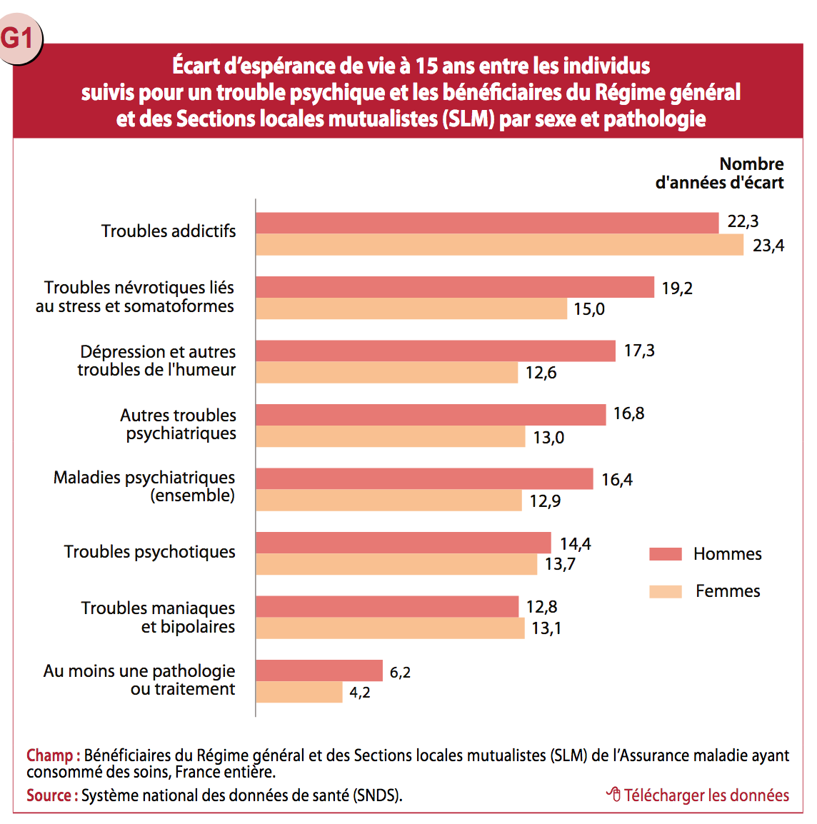 La réduction de l’espérance de vie de ces individus atteint en moyenne 16 ans chez les hommes et 13 ans chez les femmes avec des variations en fonction des troubles considérés. Ces personnes ont des taux de mortalité deux à cinq fois supérieurs à ceux de la population générale, quelle que soit la cause de décès, et un taux de mortalité prématurée quadruplé. Ces premiers résultats encouragent à développer des travaux visant à expliquer cette surmortalité ainsi qu’à mener en parallèle des actions ciblées pour réduire les inégalités de santé dont sont victimes les personnes vivant avec un trouble psychique.