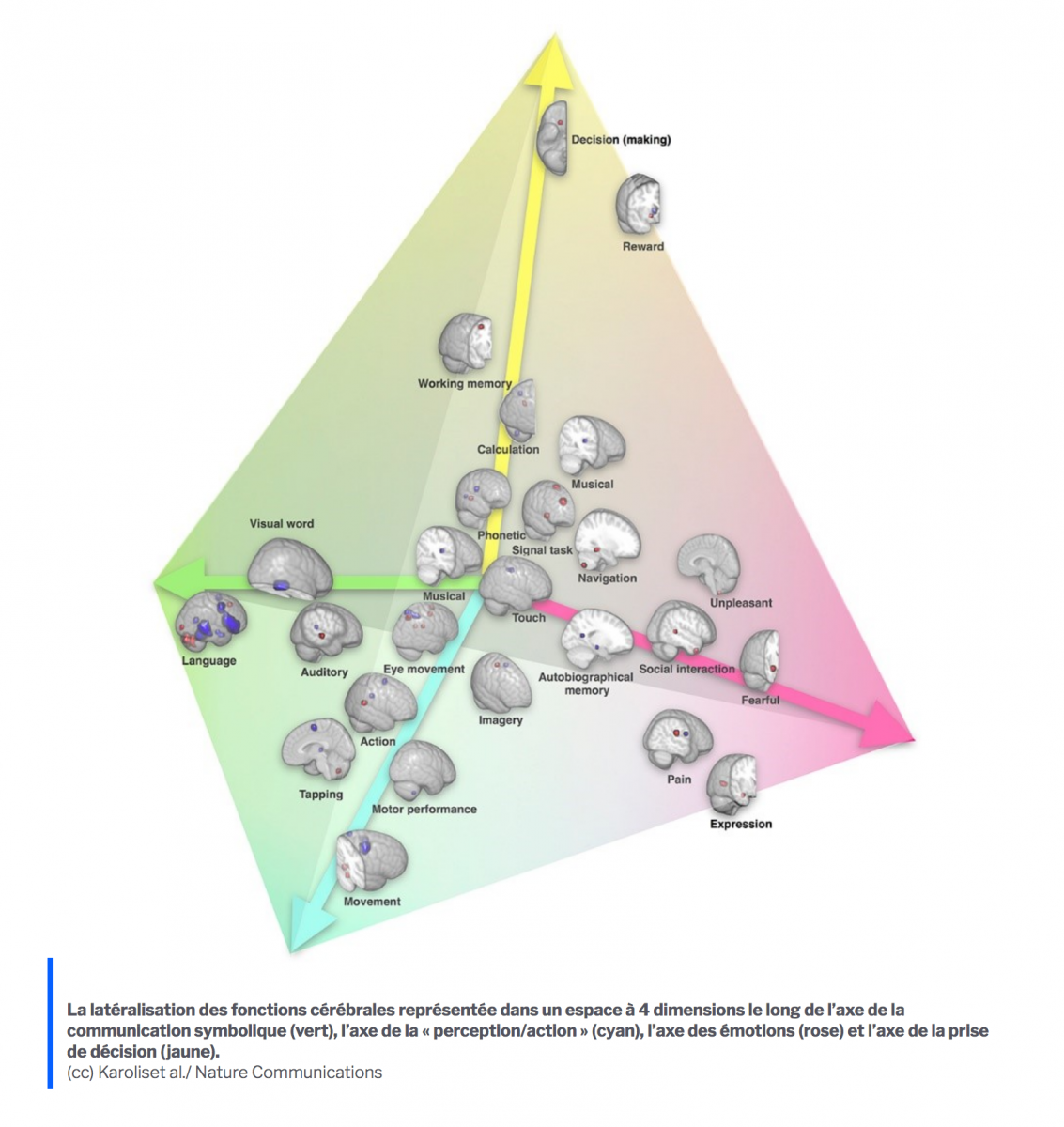 Les chercheurs ont ainsi identifié quatre groupes de fonctions extrêmement latéralisées utilisant des régions cérébrales communes : la communication symbolique (où l’on retrouve le langage, la lecture et le calcul, par exemple) très latéralisée à gauche ; le groupe « perception/action » et les émotions latéralisés à droite et enfin la prise de décision, qui reposerait plutôt sur des régions du lobe frontal droit. Ce dernier point est tout à fait novateur, aucune équipe n’ayant encore décrit d’asymétrie entre les hémisphères lors de la prise de décision.