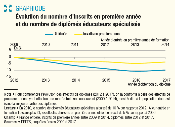 En 2017, 13 900 élèves sont inscrits dans l’un des 85 établissements dispensant une formation d’éducateur spécialisé, dont 4 300 en première année. Le nombre de diplômés de cette formation s’élève à 4 100 en 2017. Il a baissé de 10 % en cinq ans, ce qui s’explique en partie par un recul du nombre d’inscrits en première année depuis plusieurs années.