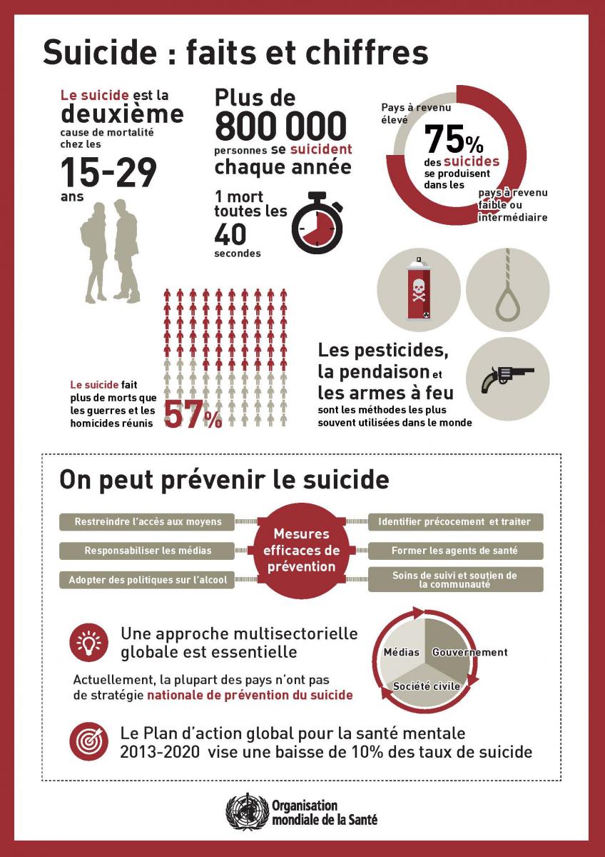 Chaque année, près de 800 000 personnes se suicident dans le monde et beaucoup d’autres font une tentative de suicide. Chaque suicide est une tragédie qui touche les familles, les communautés et des pays entiers et qui a des effets durables sur ceux qui restent. Le suicide intervient à n’importe quel moment de la vie et était la 2e cause de mortalité chez les 15-29 ans dans le monde en 2016.
