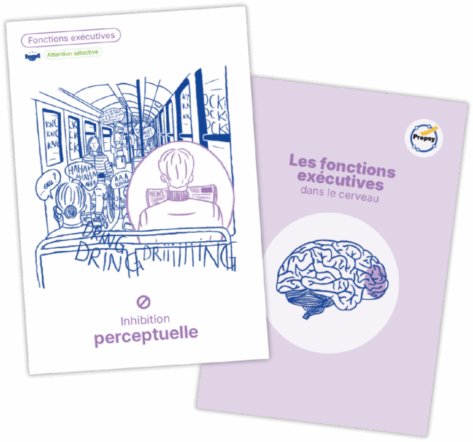 Cette approche illustrée favorise la compréhension et la mémorisation des concepts et renforce leur appropriation en les ancrant dans des situations du quotidien. Pour exemples, l’attention sélective (capacité à se focaliser sur une information précise au milieu d’autres éléments) est illustrée par la mise en situation du choix d’un aliment à acheter parmi d’autres ; l’inhibition perceptuelle (capacité à filtrer les signaux non pertinents de l’extérieur) est représentée par le fait de parvenir à faire abstraction des bruits extérieurs dans un transport en commun pour lire son journal (voir ci-dessus)…