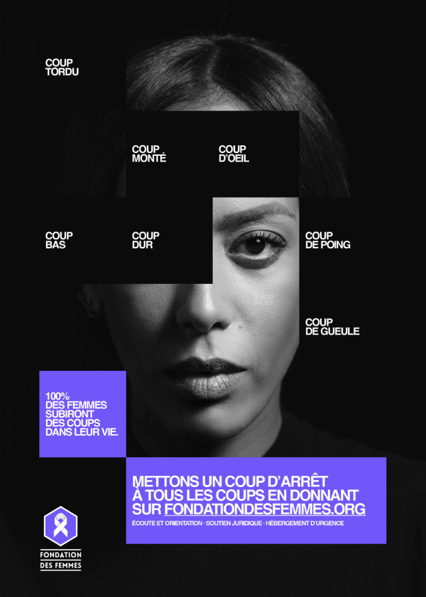 “Coup de gueule, coup de poing, coup d’œil, coup tordu ou coup bas, 100 % des femmes ont subi, subissent ou subiront des violences au cours de leur vie.” C’est le constat alarmant à l’origine de la campagne “Coup d’arrêt”, conçue par l’agence Les Gros mots*- pour la Fondation des Femmes à l’occasion du 25 novembre, Journée internationale pour l’élimination des violences à l’égard des femmes.
