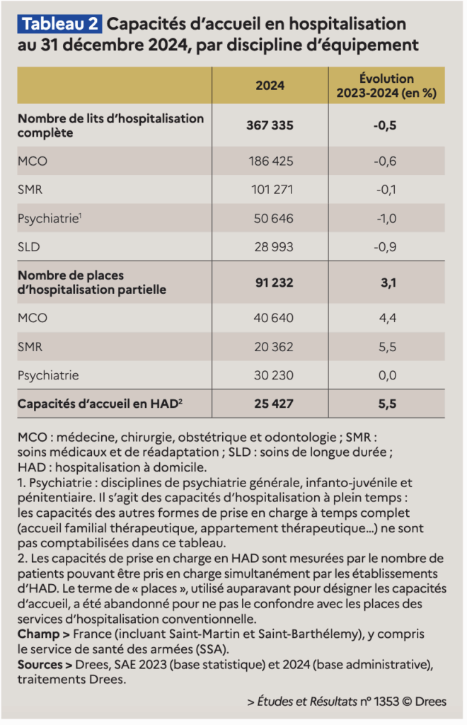 Dans les établissements de santé en 2024, la baisse du nombre de lits ralentit et les alternatives à l’hospitalisation complète poursuivent leur progression, Drees, novembre 2025, n° 1353