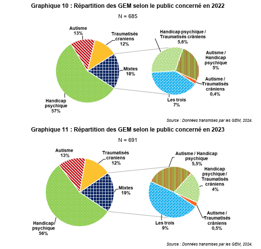 – Le nombre de GEM varie entre 3 et 126 par région, avec une prédominance de GEM dédiés au handicap psychique.