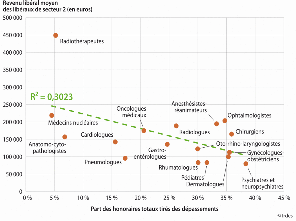 Au sein des spécialistes libéraux de secteur 2*, la hiérarchie des revenus entre spécialités apparaît peu corrélée au niveau des dépassements d’honoraires, au contraire. Par exemple les radiothérapeutes, les médecins nucléaires et les anatomo-cyto-pathologistes sont les spécialités ayant les revenus les plus élevés alors que leurs dépassements d’honoraires représentent une fraction très faible de leurs honoraires. Les radiologues et les oncologues ont des revenus élevés alors que la part des honoraires tirée des dépassements est en moyenne de 20 % à 25 %, soit nettement inférieure à la moyenne toutes spécialités confondues. Certaines spécialités médico-chirurgicales et chirurgicales comme les ophtalmologues, les chirurgiens ou les anesthésistes-réanimateurs ont à la fois des revenus élevés et une part élevée des dépassements dans l’ensemble de leurs honoraires.