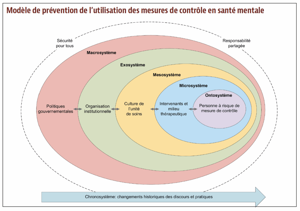 Le modèle de prévention de l’utilisation des mesures de contrôle en santé mentale est un modèle systémique. Il met en évidence cinq cibles d’intervention spécifiques pour réduire l’isolement et la contention mécanique. Il promeut ainsi une approche de responsabilité partagée entre les acteurs de plusieurs systèmes et permet d’établir des actes spécifiques pour chacun des systèmes étudiés afin de réduire le risque de recours aux mesures coercitives.