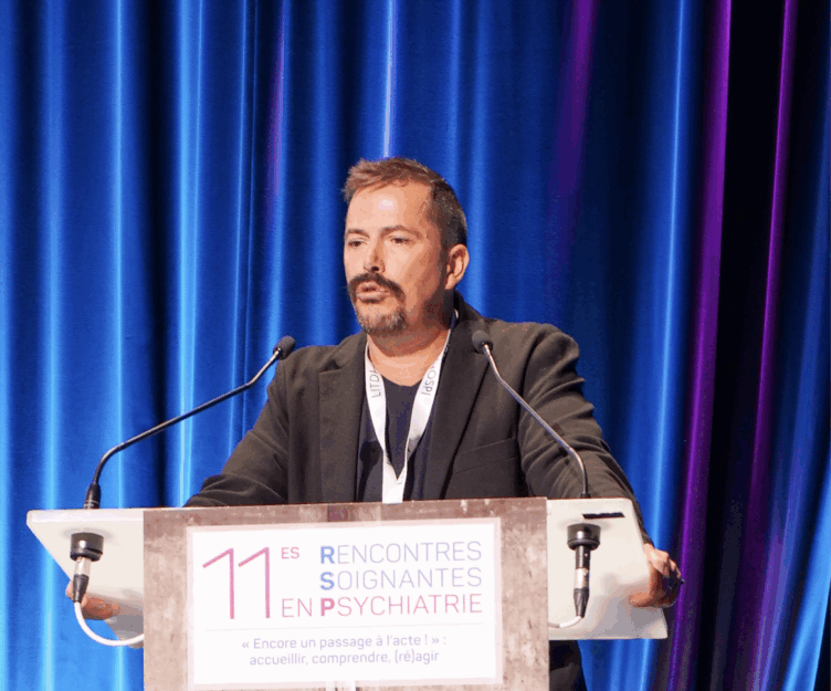 Photo : Benjamin Villeneuve communique aux Rencontres soignantes en psychiatrie le 14 octobre 2025. Cette intervention fait l’objet d’un article dans le numéro 304 de santé mentale, à paraître fin février 2026. © Santé mentale