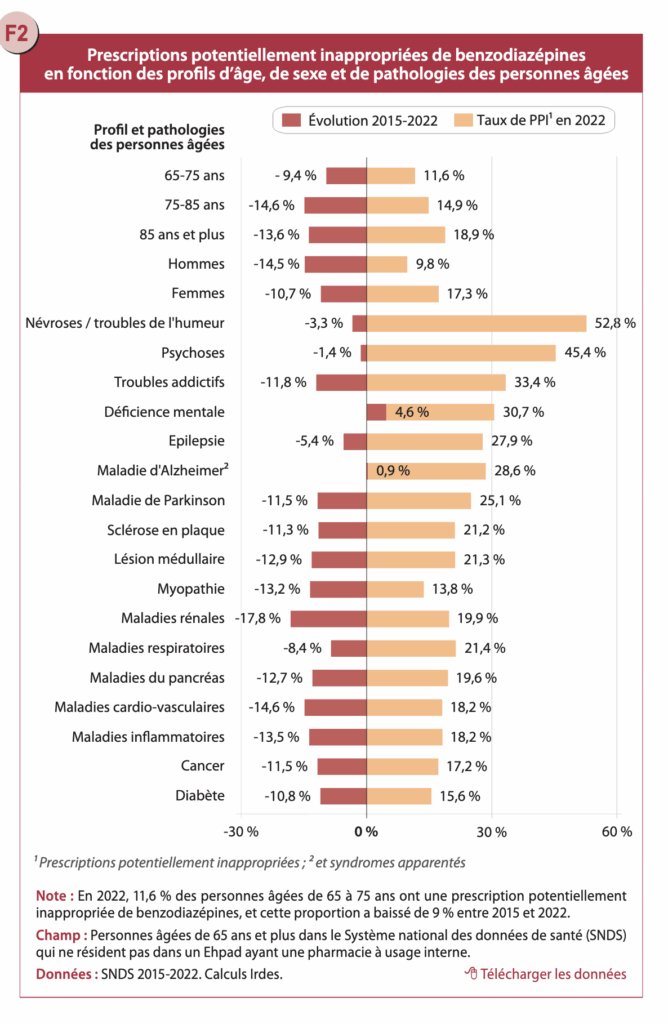 baisse, commune à l’ensemble des pays de l’OCDE : en 2012, 28 % des Français âgés de 65 ans et plus reçoivent une prescription de benzodiazépines, et 17 % une prescription potentiellement inappropriée ; en 2022, ces taux baissent pour atteindre respectivement 23 % et 13 %. Chez les personnes atteintes de pathologies psychiques ou neurovégétatives, les taux, parmi les plus élevés, sont restés stables durant cette période.