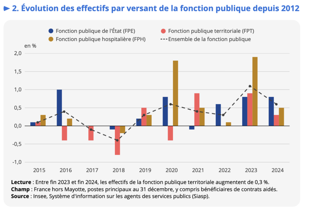 Fin 2024, 5,9 millions d’agents travaillent dans la fonction publique : c’est 32 800 agents de plus que l’année précédente, soit +0,6 %, une hausse inférieure à celle de 2023 (+1,1 %). L’emploi augmente de 0,8 % dans la fonction publique de l’État, de 0,3 % dans la fonction publique territoriale et de 0,5 % dans la fonction publique hospitalière (FPH).