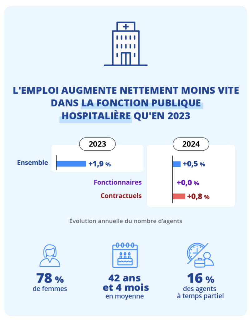 Après une hausse de 1,9 % en 2023, soit +23 500 agents, les effectifs de la FPH continuent de croître mais dans une moindre mesure : +0,5 %, soit +5 700 agents.