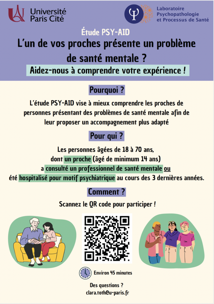 L’objectif de l’étude PSY-AID, menée au sein de l’Université Paris Cité, est de mieux comprendre comment les proches s’adaptent aux problèmes de santé mentale d’un membre de leur entourage, la vision qu’ils ont de ces difficultés mais aussi de leurs conséquences.