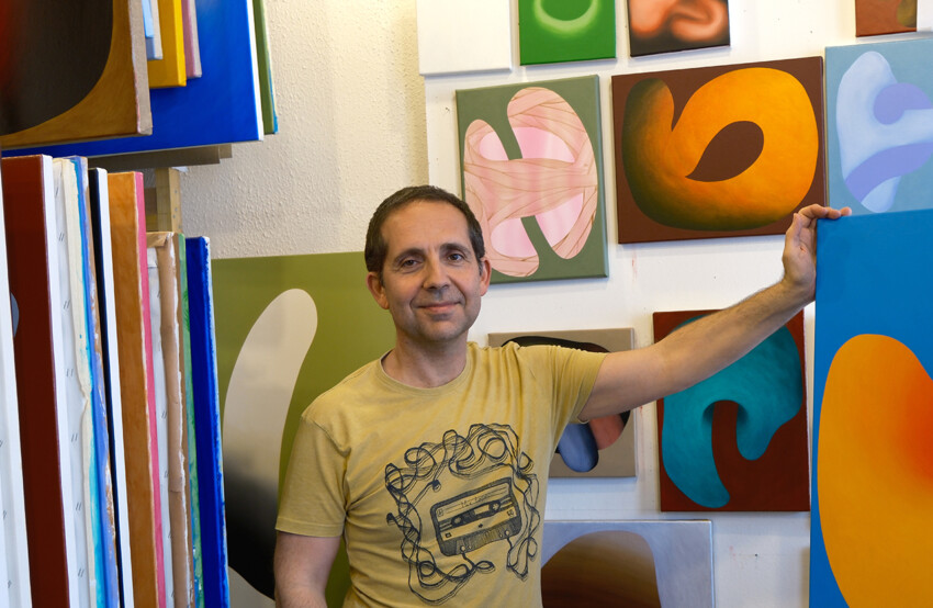 La peinture de Laurent Marty, aux formes organiques et aux couleurs vibrantes, joue avec l’ambiguïté des plans, le travail en réserve (et fait ainsi apparaître le blanc de la toile), la silhouette et le contre-jour, les ambivalences du concave et du convexe, du plein et du vide, pour questionner la relation de la figure au fond. Ces images étranges, d’une présence plastique et chromatique forte, possèdent une singulière dimension allusive. Méticuleuse et très dessinée, c’est une pratique qui s’amuse à renverser les étapes de l’élaboration de l’œuvre peinte. L’espace du fond pictural arrive en dernier dans l’exécution et définit les formes, les cernes d’un contour arrêté, tout en jouant et luttant avec elles.