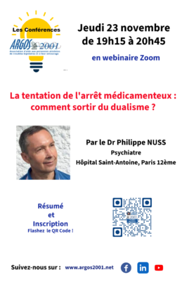Conférence par le Dr. Philippe NUSS organisée par l’Association d’aide aux personnes atteintes de troubles bipolaires et à l’entourage (Argos)