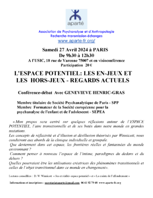 «Mon propos sera centré sur quelques réflexions autour de l’ESPACE POTENTIEL, l’aire transitionnelle et de ses butés dans notre monde en grandes mutations. Les concepts de réflexivité et d’illusion et désillusion théorisés par Winnicott, nous conduiront aux abords de la clinique individuelle et groupale. Que deviennent dans cet espace, les frontières réelles et fantasmées du monde environnant ? Comment penser à nouveau l’espace de l’intime, paradigmes du dedans et du dehors ? Quelles pourraient être les utilisations créatrices des phénomènes transitionnels et celles de l’obiet transitionnel dans ce monde en changement».